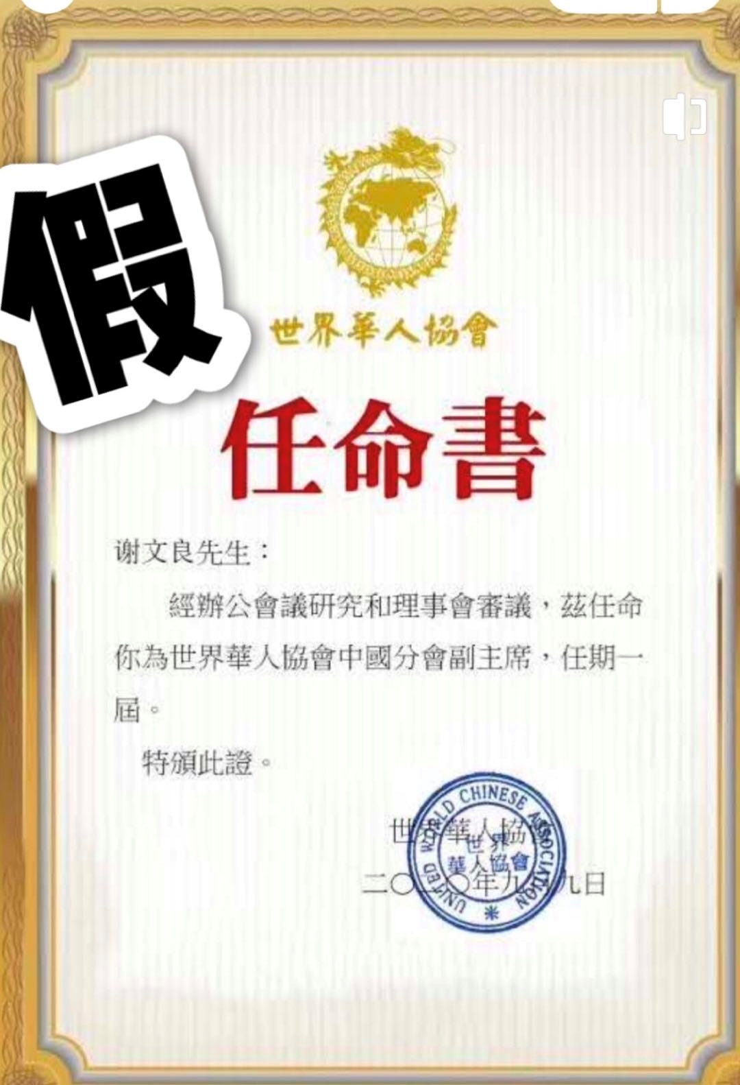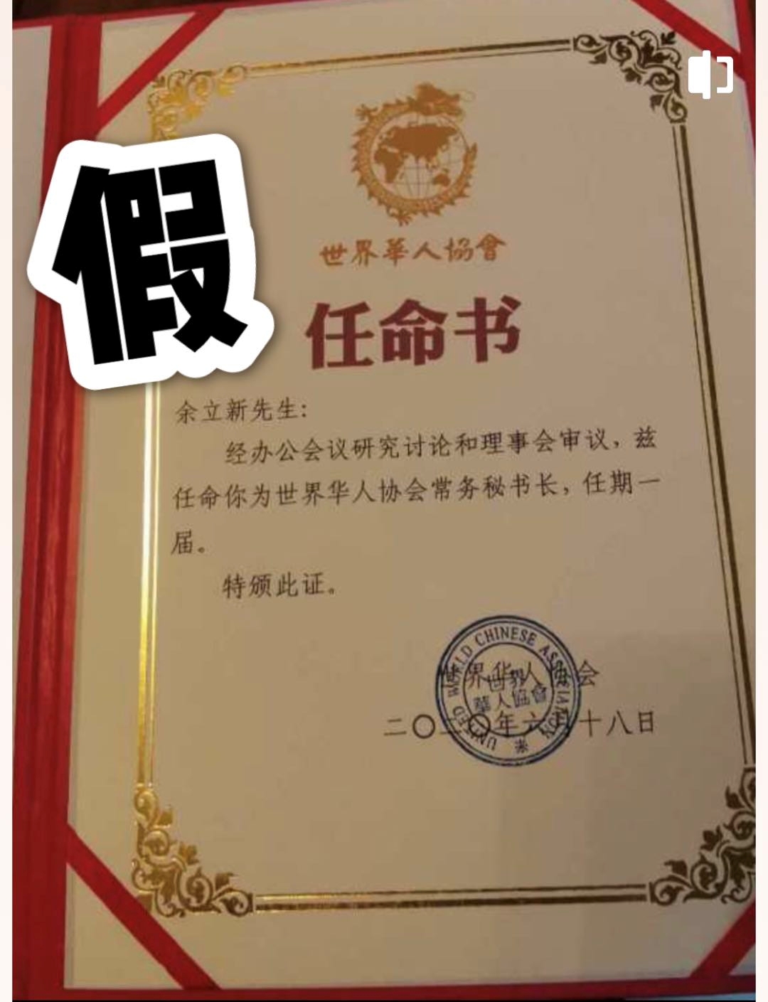 本會發現近日在中國國內有人假借世界華人協會之名義多次頒發任命書。任命余立新爲世界華人協會常務秘書長,謝文良爲世界華人協會中國分會副主席。